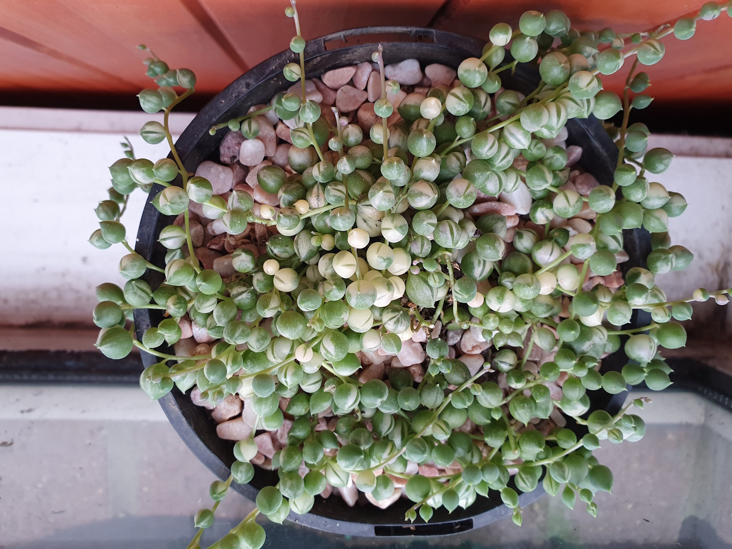 Ha kevés a fény, a hajtások megnyúlnak, a „gyöngyök” ritkulnak, és a szín is fakóbbá válik. Egy keleti vagy nyugati fekvésű ablak közelében általában jól érzi magát, télen pedig akár kaphat kicsit több napfényt is.