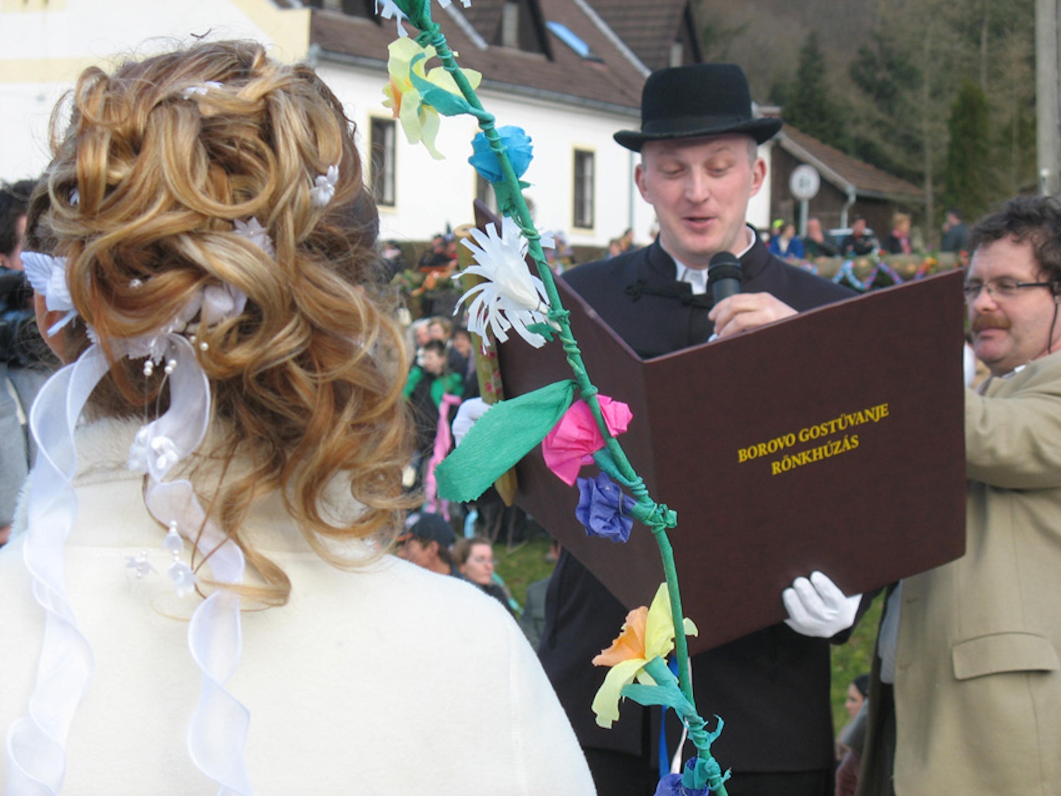 A jelmezesek között álesküvőre készülő menyasszony és vőlegény, szerepet cserélő legények és korabeli alakok tűnnek fel. A hosszú fenyőrönkhöz szimbolikusan a hajadonokat kötik, a menet pedig lakomával és farsangi játékkal ér véget.